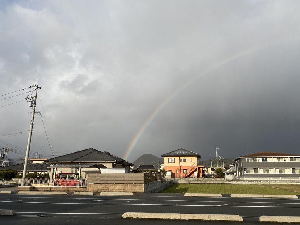 二月が終わり春を迎えようとする頃。朝から降っていた雨もあがって、まだ半分暗い空に虹がかかっていた。